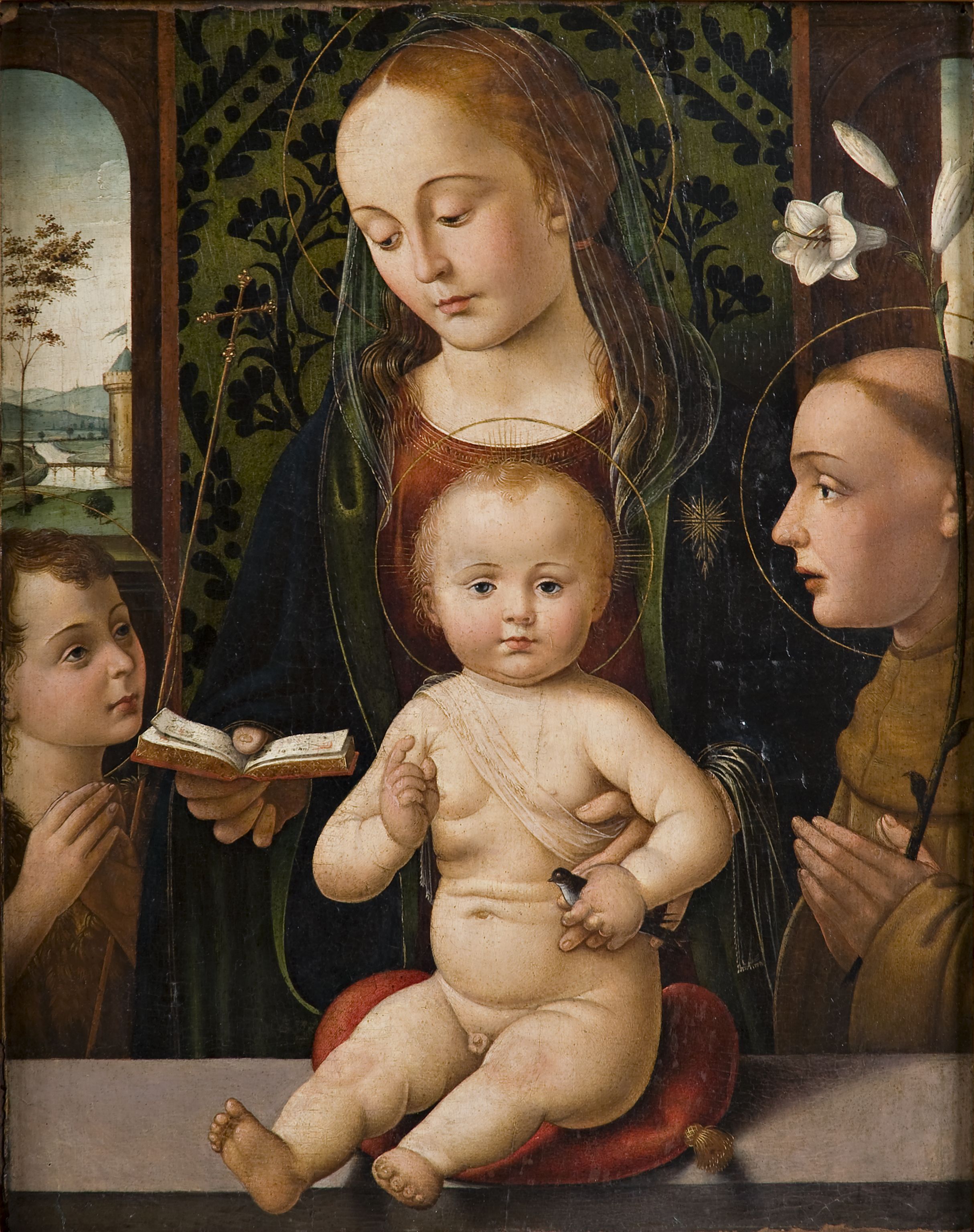 In an interior, the Virgin Mary reads from a prayer book in her right hand while using her left to hold the Baby Jesus, who is seated on a red cushion resting on a ledge. Jesus imparts a blessing with one hand while holding in the other a goldfinch symbolising his future Passion, a bird that Christian legend claims stained its plumage with the blood of the crucified Christ. On either side of the two main figures we see, on the left, the young St. John the Baptist, Jesus’s cousin, in a camelskin tunic, and on the right, St. Anthony of Padua portrayed as a young man yet recognisable by his Franciscan habit and by the lily in his hand. On the left, through an arched window, we can see an orderly landscape with a river and a tower.