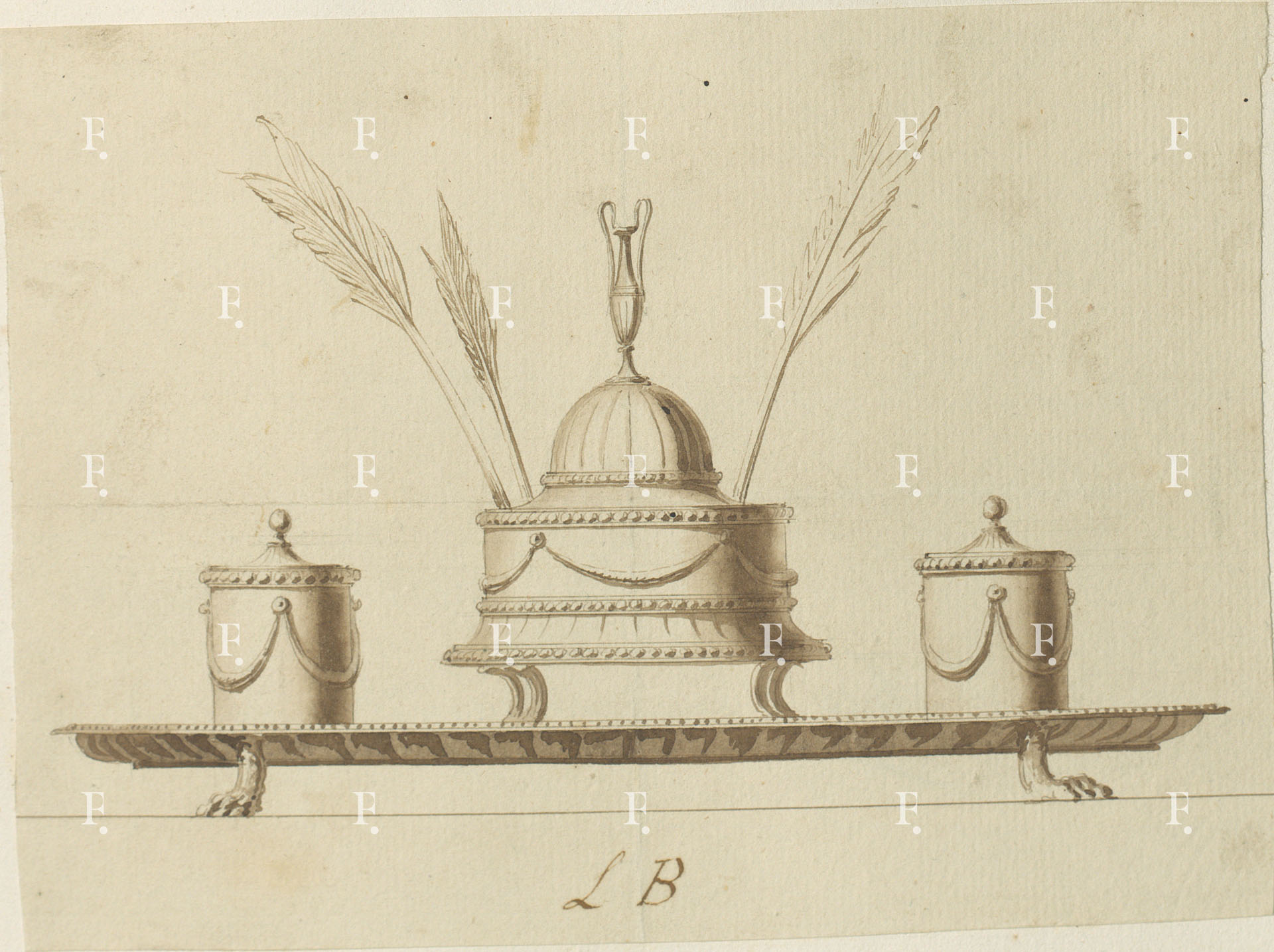 Workshop of Giuseppe Valadier, Silver desk set, c. 1795-1800, graphite, pen, grey ink, grey wash on paper, 155 x 205 mm.; inscription in pen bottom centre: “L B”.