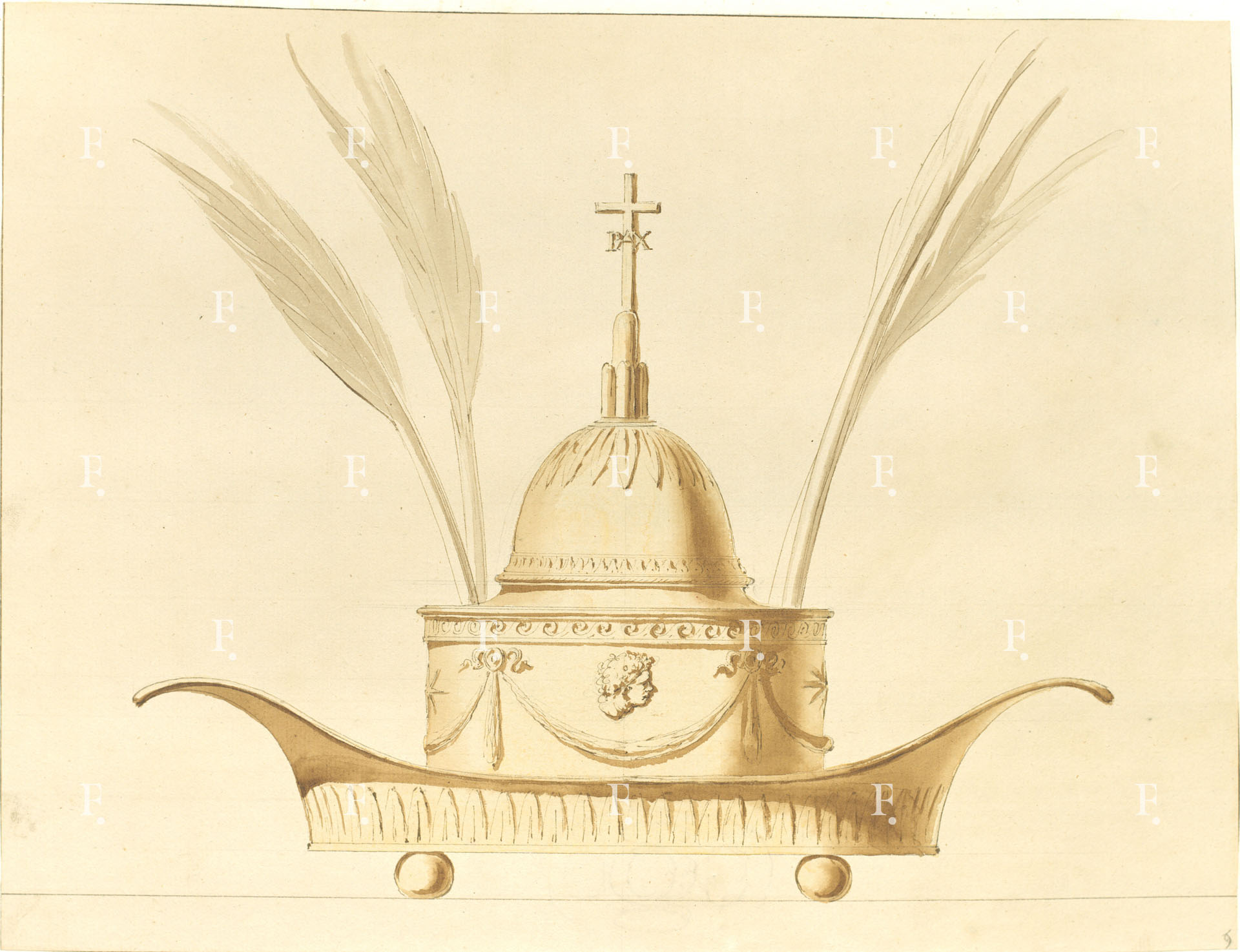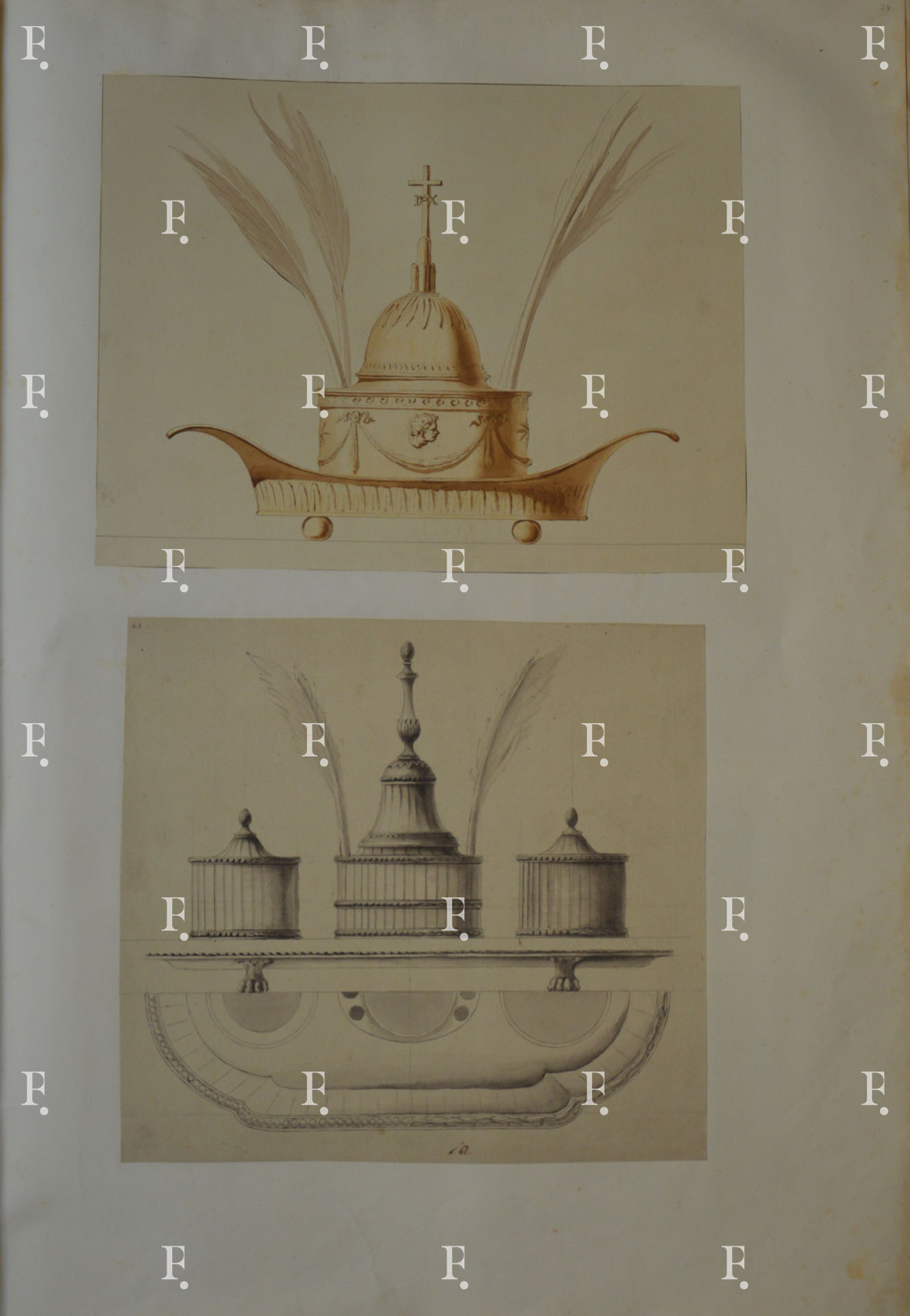 Workshop of Luigi Valadier, Silver gilt desk set with the heraldic emblems of the Chigi family (six mountains surmounted by an eight-pointed star), c. 1775, graphite, pen, grey ink, brown, yellow and grey wash on paper, 285 x 370 mm.
