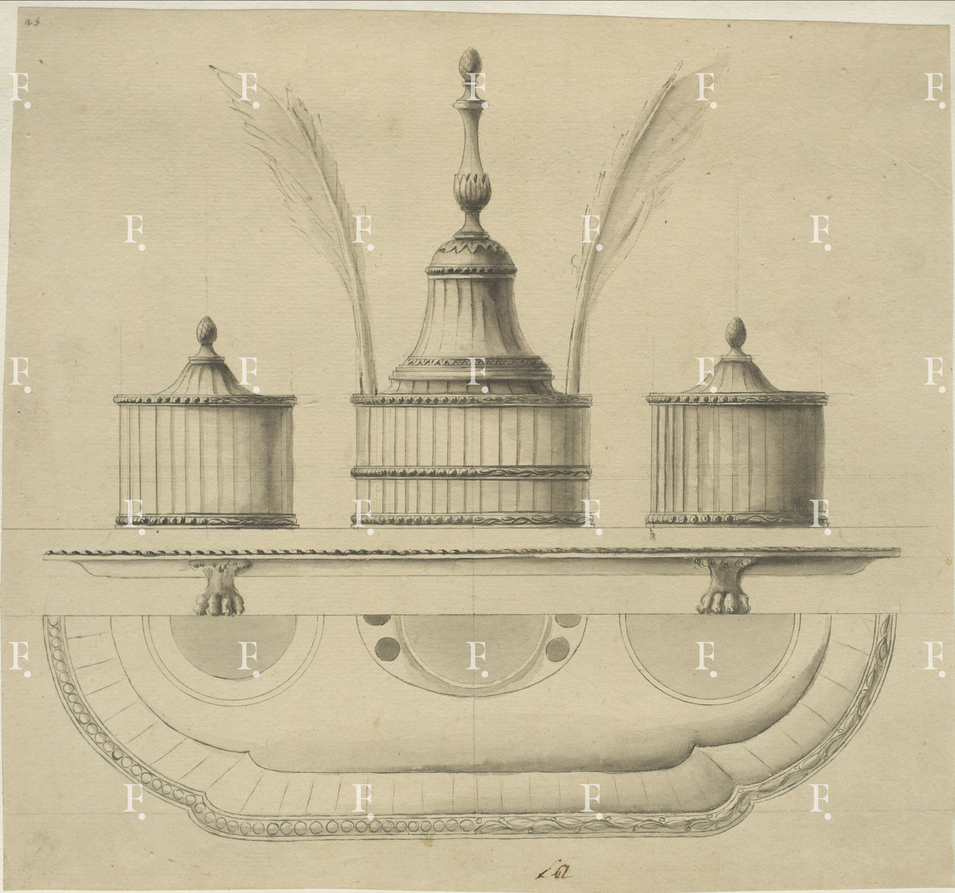 Giuseppe Valadier, Silver desk set, c. 1780-90, graphite, pen, grey ink, grey wash on paper, 310 x 335 mm.; indistinctly initialled in pen below; numbered upper left: “25”.