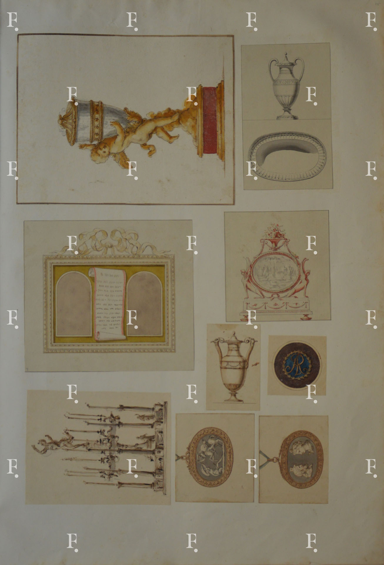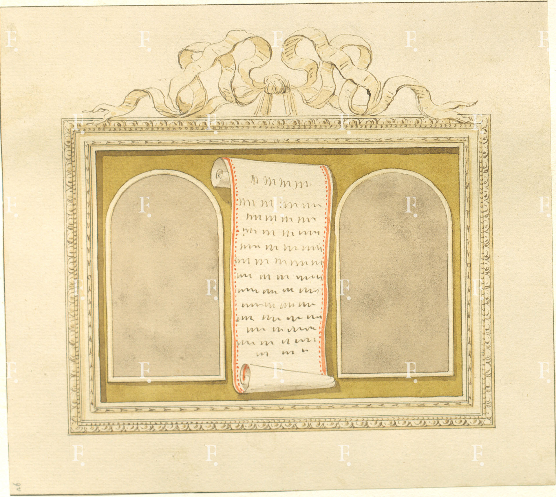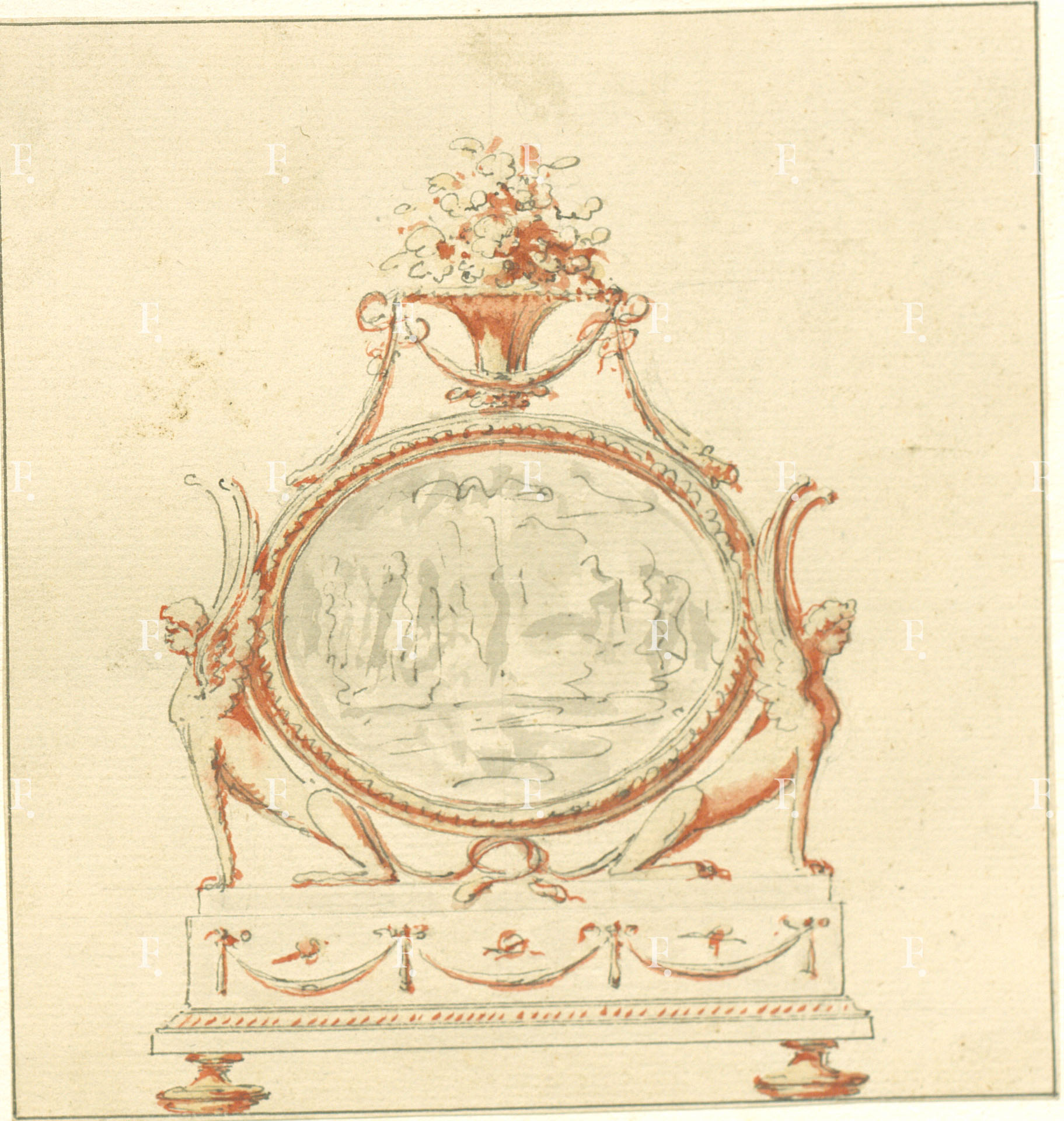 Workshop of Luigi Valadier, Ormolu or silver gilt frame with ornamental motif of a knotted ribbon at the top, c. 1770-5, graphite, pen, brown ink, brown, green and red wash on paper, 205 x 230 mm.