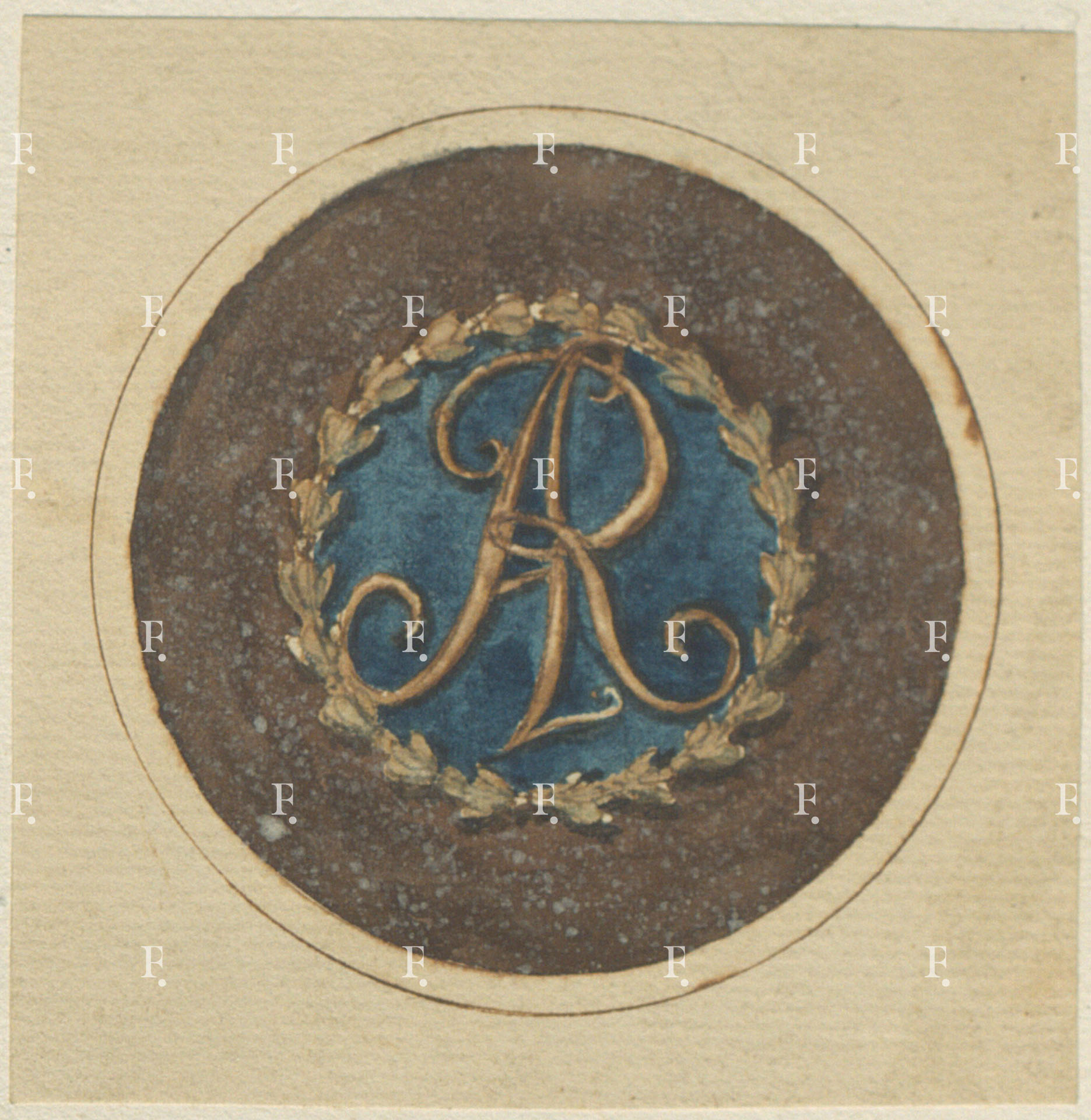 Workshop of Giuseppe Valadier, Monogram enclosed in a laurel wreath on a lapis lazuli and porphyry ground (probable the lid of a snuffbox), c. 1800-10, graphite, pen, brown ink, dark red, blue and brown wash on paper, 80 x 80 mm.