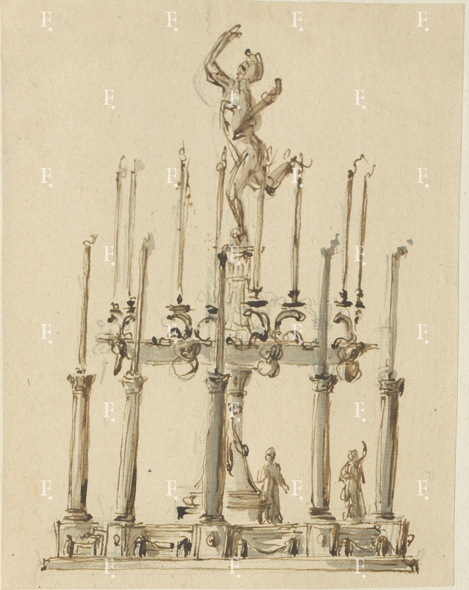 Workshop of Luigi Valadier, Candlestick with a double row of candles, with circular base and stand; at the top, Giambologna’s Mercury, c. 1780-5, graphite, pen, brown ink, grey wash on paper, 195 x 150 mm.