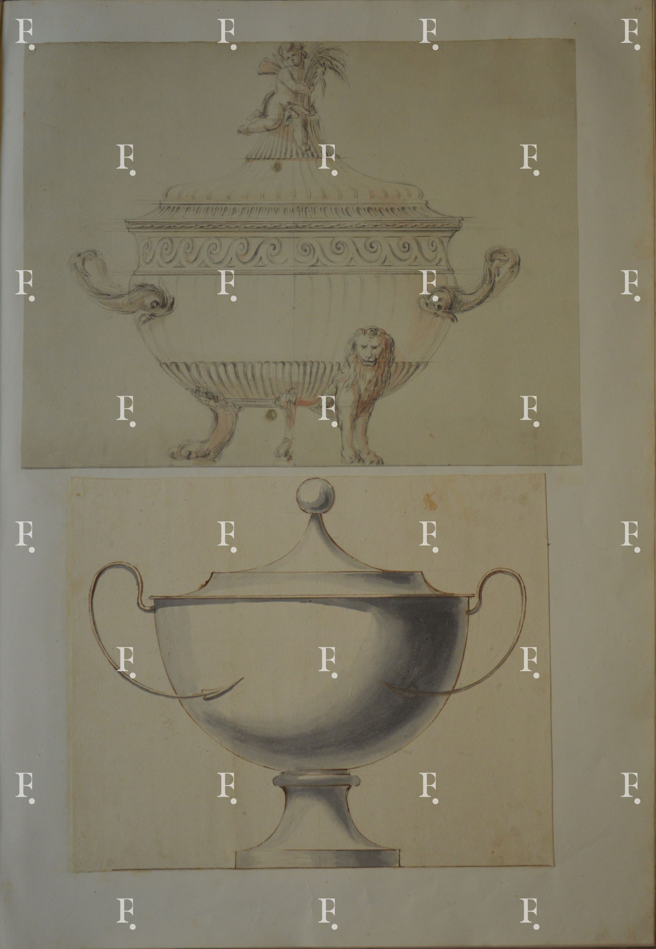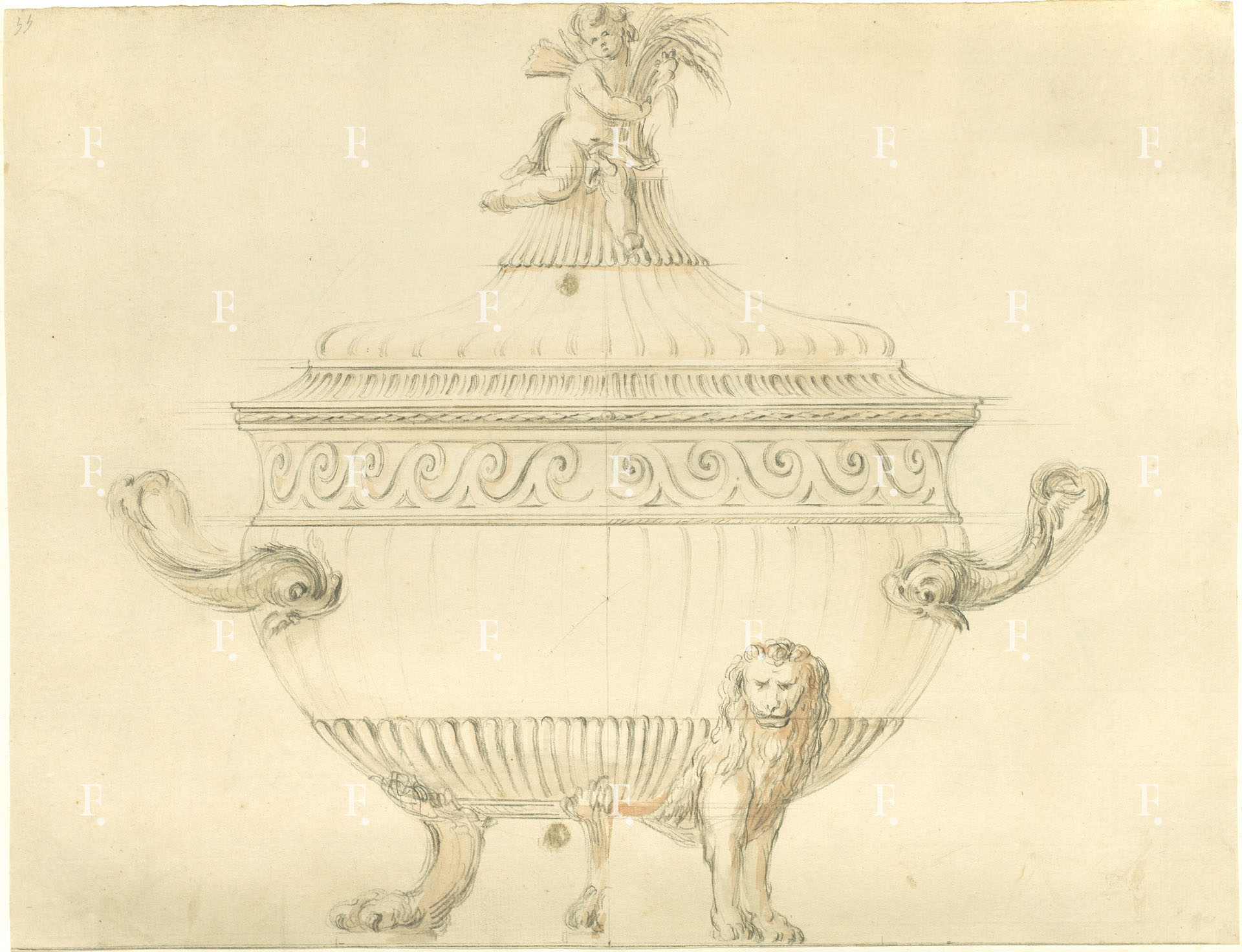 Workshop of Luigi Valadier, Silver tureen with the variant of the feet; winged putto with wheatsheaf for the knob of the lid, c. 1775-80, graphite, black chalk, reddish wash on paper, 345 x 450 mm.; numbered upper left: “55”.