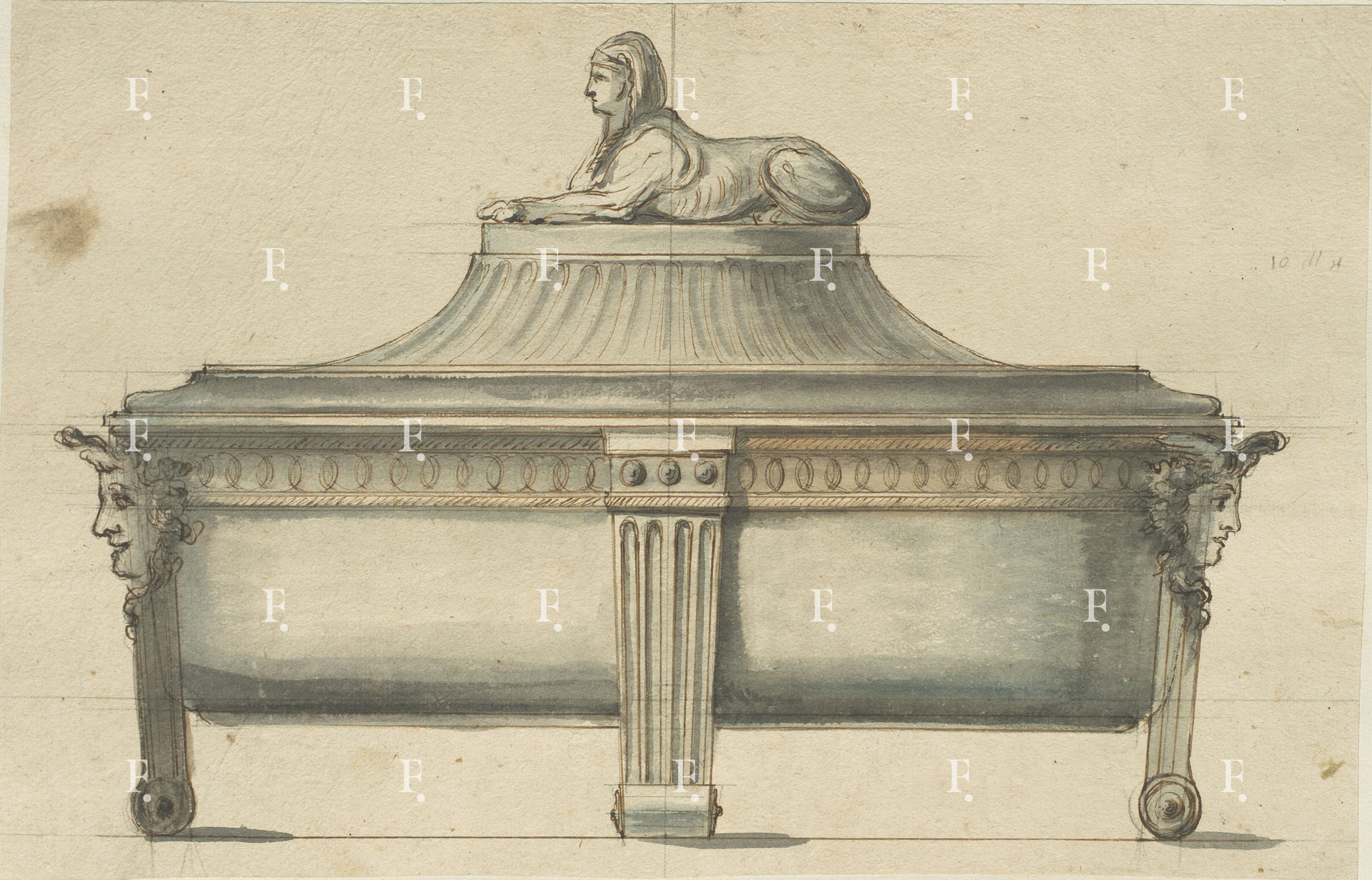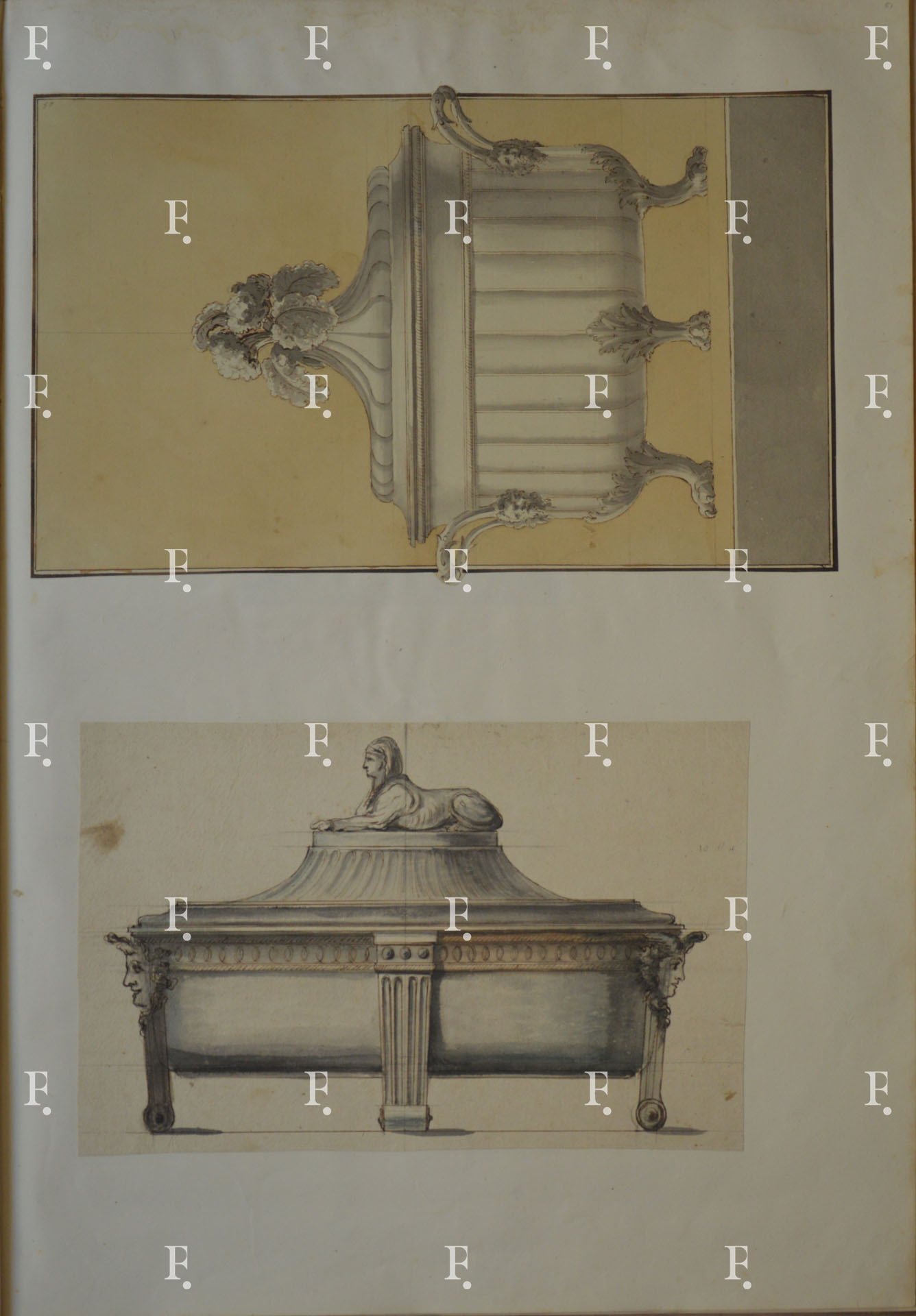 Luigi Valadier, Silver dish with a sphinx for the knob of the lid, c. 1780-5, graphite, pen, brown ink, grey wash on paper, 250 x 390 mm.