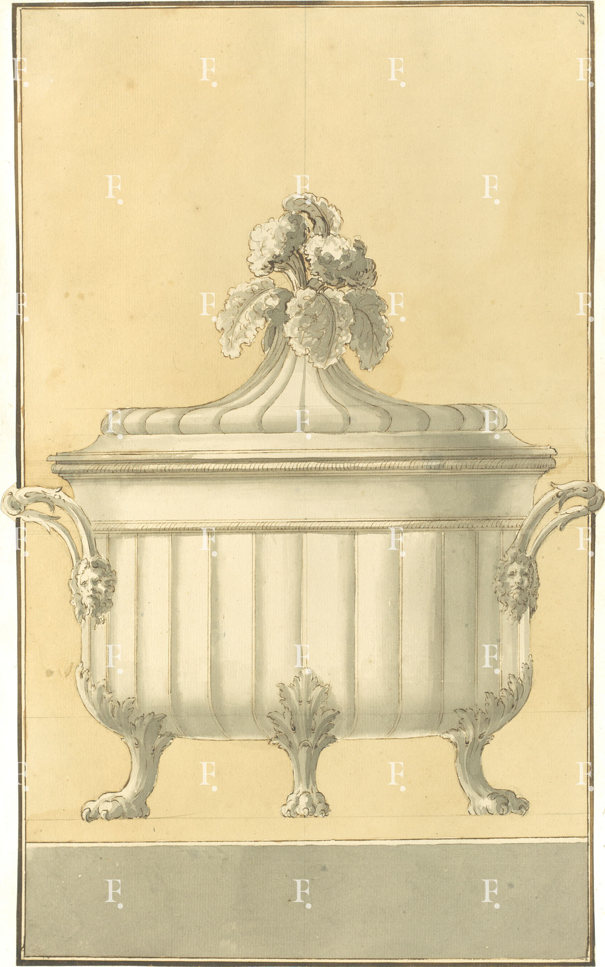 Andrea Valadier (?), Silver soup tureen, c. 1750-5, graphite, pen, brown ink, grey and yellow wash on paper, 465 x 280 mm.; inscribed upper left: “57”.