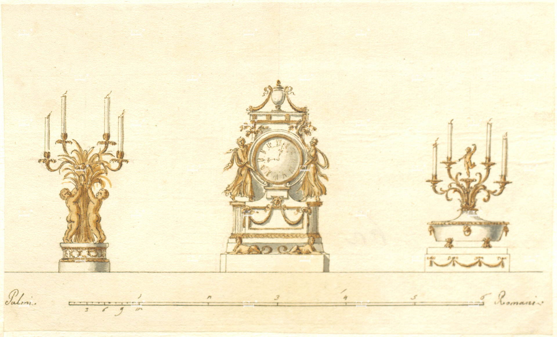 Workshop of Giuseppe Valadier, Table clock and two candlesticks, c. 1785-90, graphite, pen, grey ink, brown and grey wash on paper, 135 x 230 mm.; it bears the Roman palm scale in the lower margin.