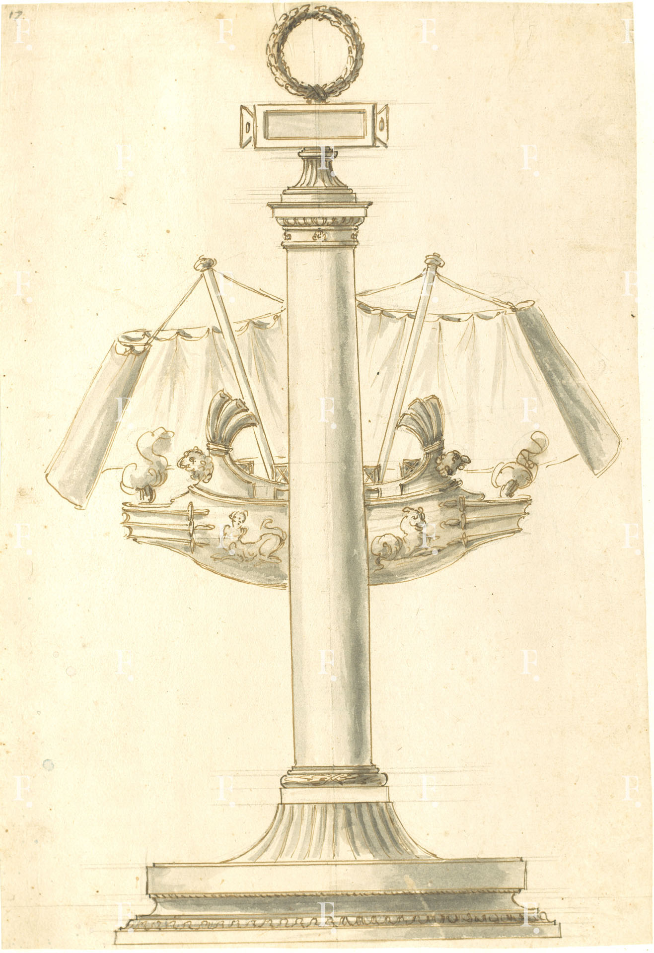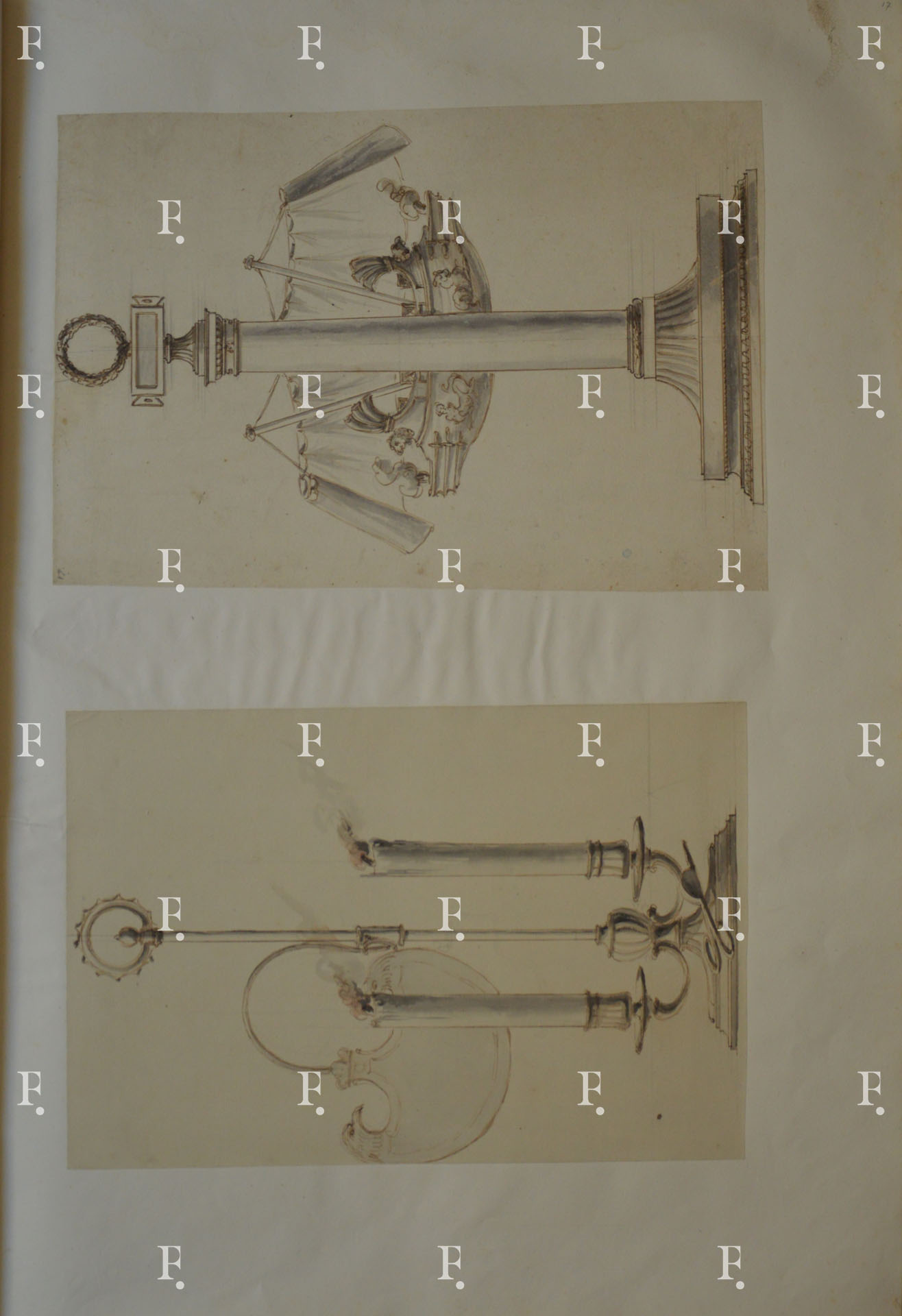 Luigi Valadier, Lucerna d’argento in forma di colonna rostrata, 1780 circa, grafite, penna, inchiostro bruno, acquerello grigio su carta, mm. 410 x 275; numerato in alto a sinistra: “17”.