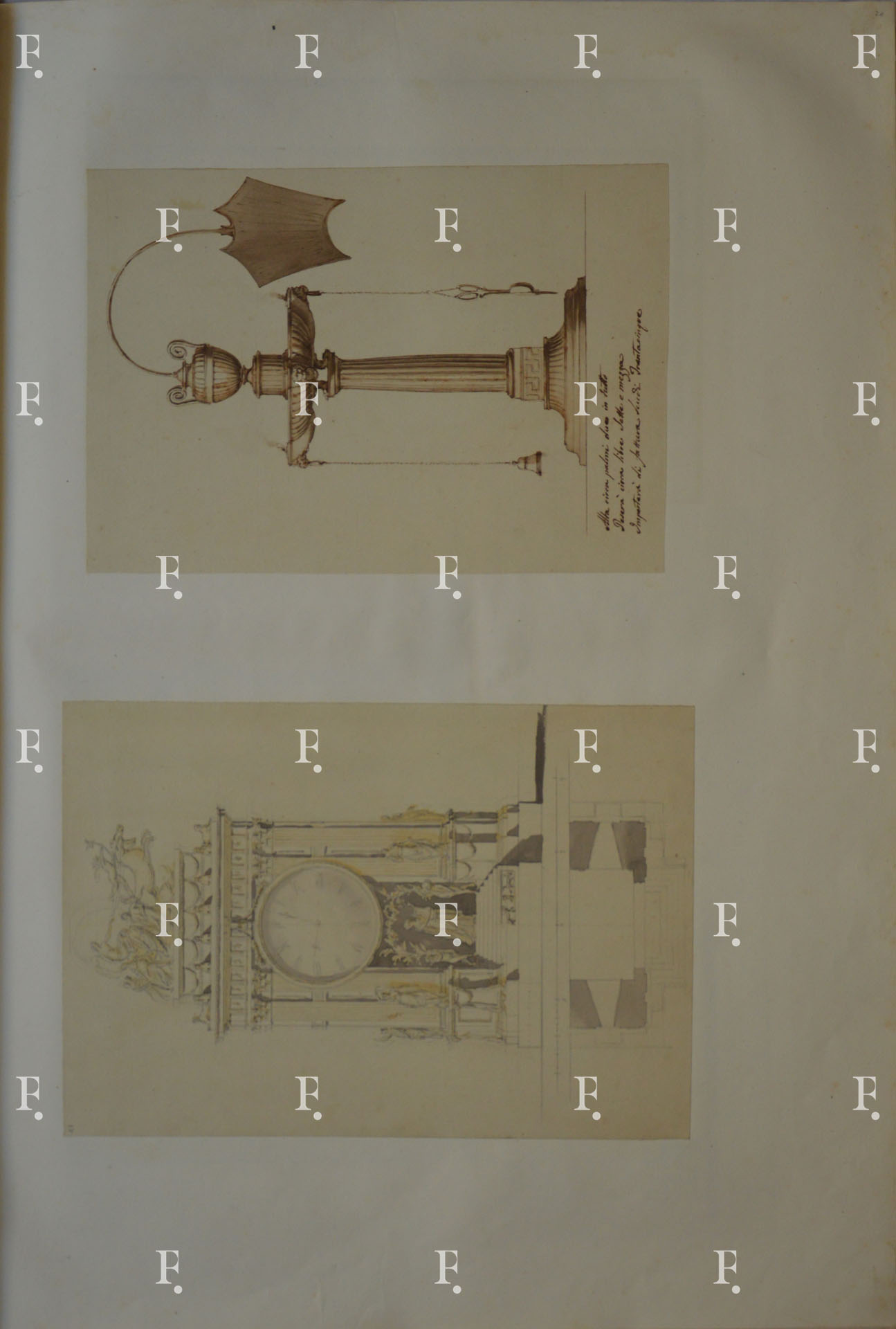 Giuseppe Valadier, Orologio da tavolo in forma di tempio a gradoni con basamento mistilineo e corpo centrale con lesene corinzie; sull’attico il carro di Apollo con le muse circondato da sfingi nel registro inferiore; sotto al quadrante Apollo citaredo, 1780-1785, grafite, acquerello grigio e giallo su carta, mm. 360 x 250; numerato in alto a sinistra: “21”.