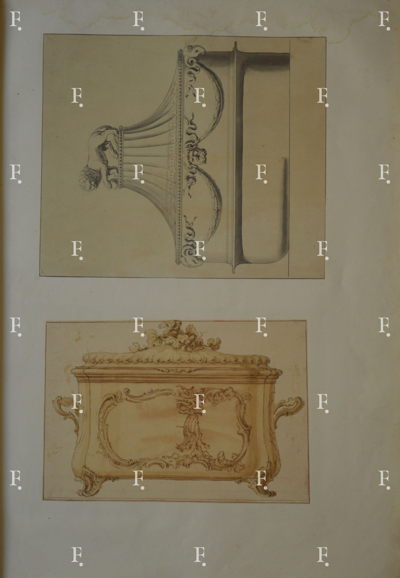 Luigi Valadier, Zuppiera d’argento dorato con la variante della riserva per lo stemma araldico e un motivo floreale alla sommità del coperchio, 1760-1765 circa, grafite, penna, inchiostro bruno, acquerello bruno su carta, mm. 235 x 340.