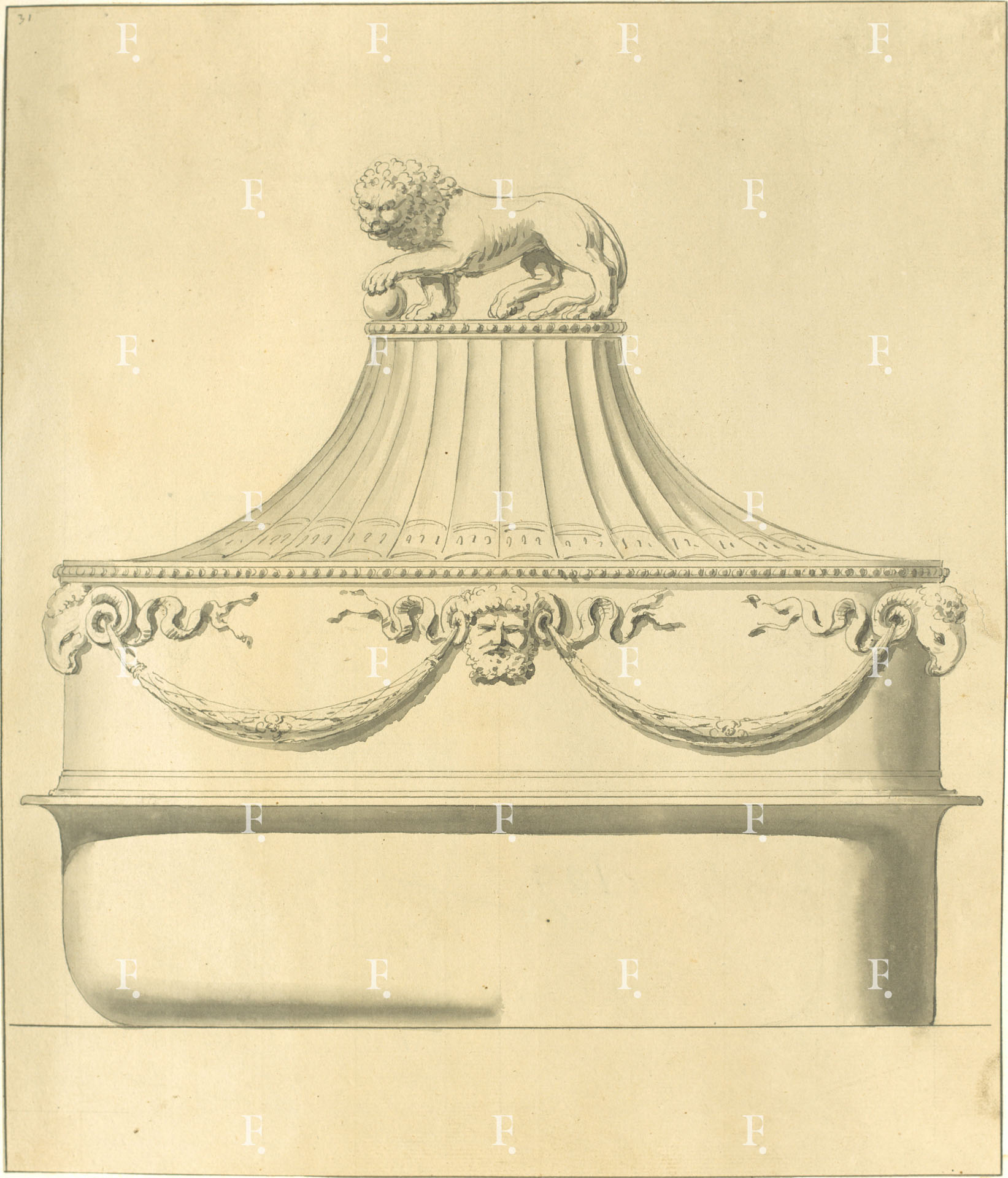 Giuseppe Valadier, Legumiera d’argento con festoni lungo il fusto e un leone passante come pomolo del coperchio, 1785 circa, grafite, penna, inchiostro grigio, acquerello grigio su carta, mm. 370 x 320; numerato in alto a sinistra: “31”.