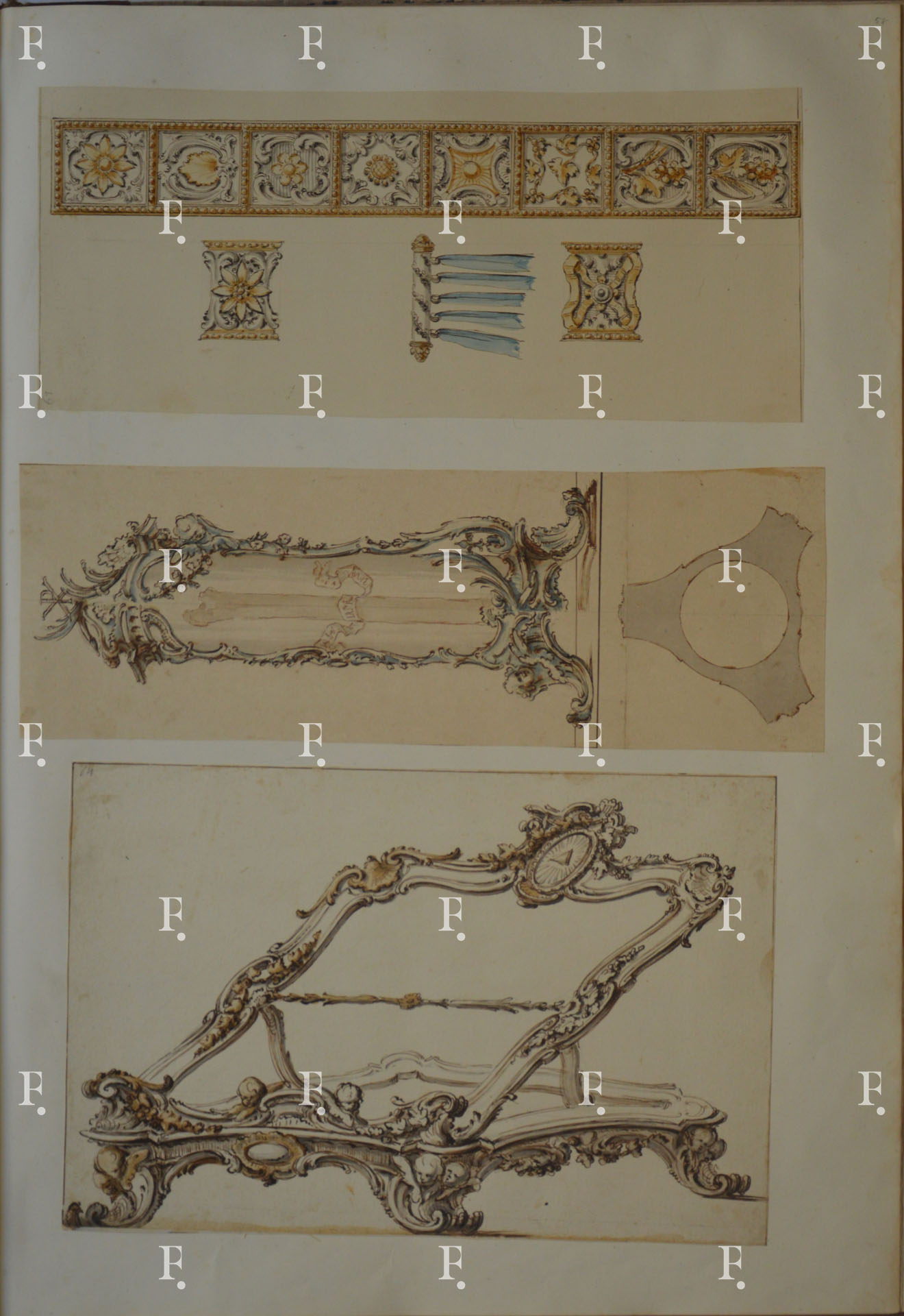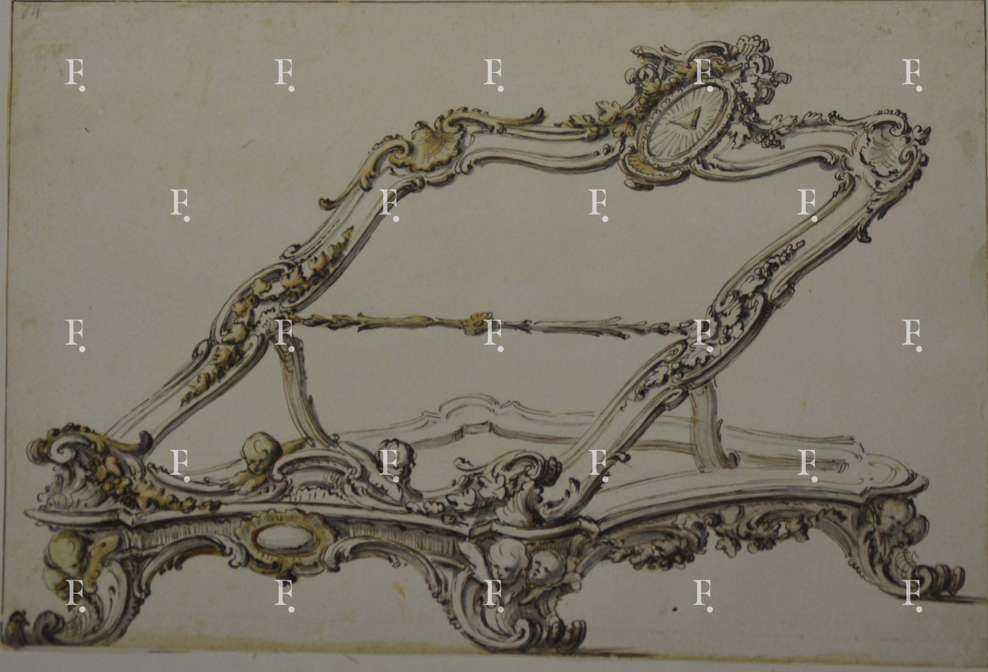 Luigi Valadier, Leggio per messale, 1760-1765 circa, grafite, penna, inchiostro bruno, acquerello bruno su carta, mm. 270 x 410; numerato in alto a sinistra: “84”.