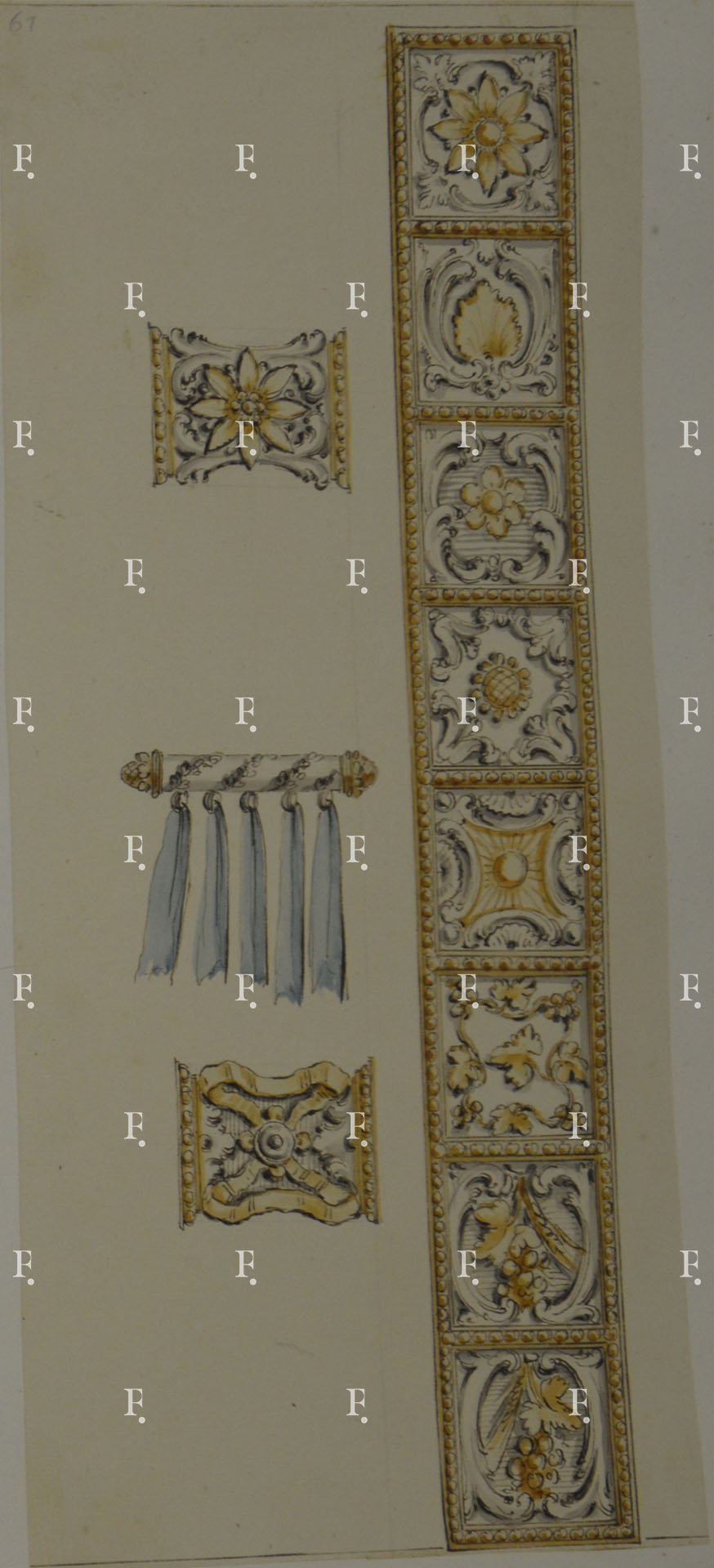 Bottega di Luigi Valadier, Cintura e fibbie, 1770-1780 circa, grafite, penna, inchiostro grigio, acquerello bruno, grigio e celeste su carta, mm. 190 x 450; numerato in alto a sinistra: “61”.