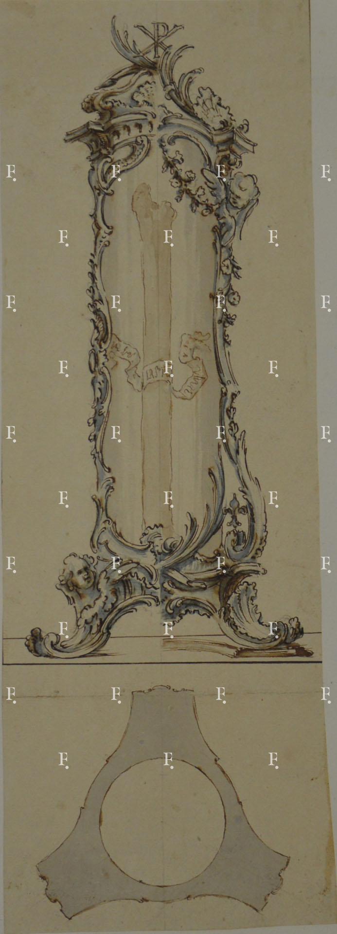 Luigi Valadier, Reliquiario, 1770 circa, grafite, penna, inchiostro bruno, acquerello celeste e bruno su carta, mm. 470 x 160.